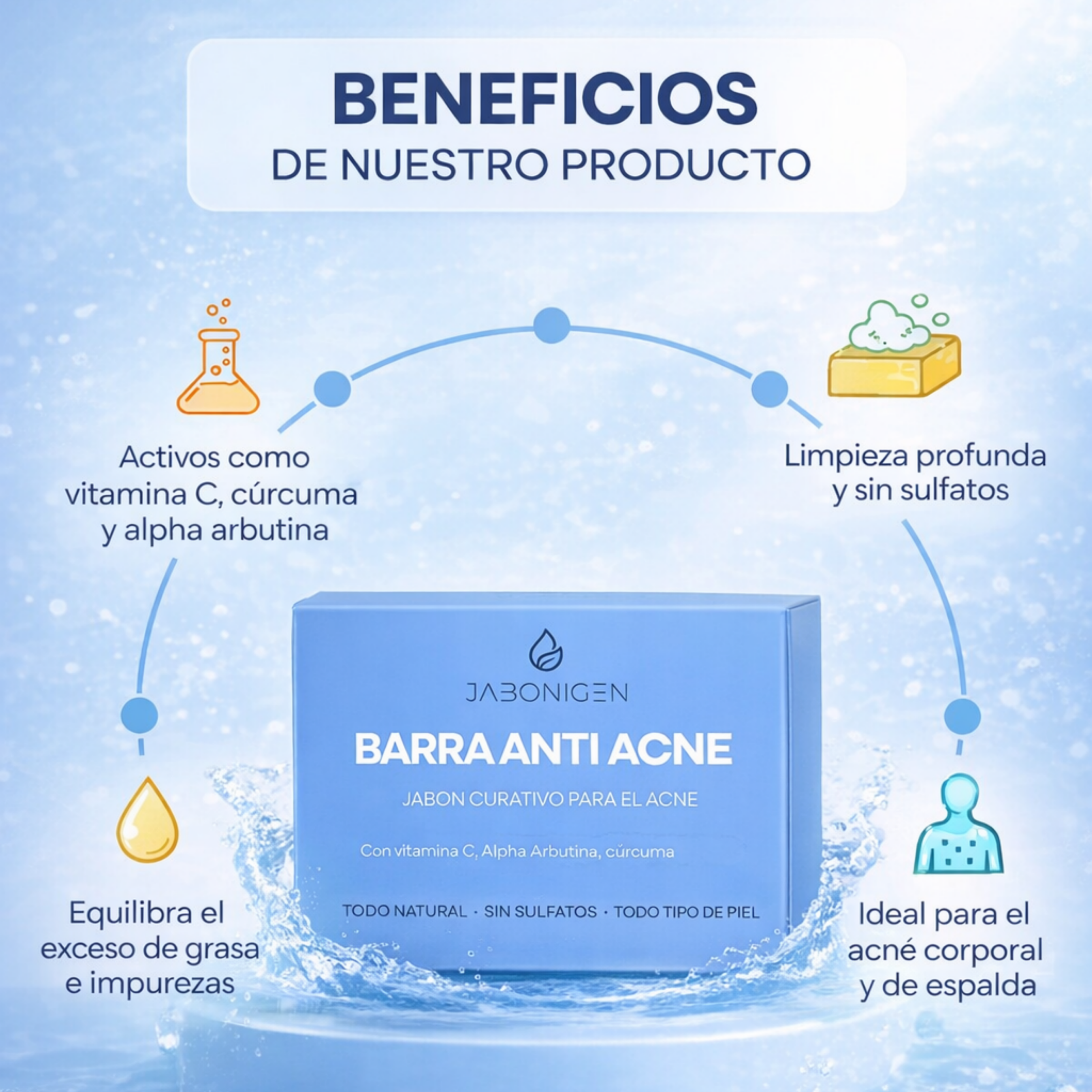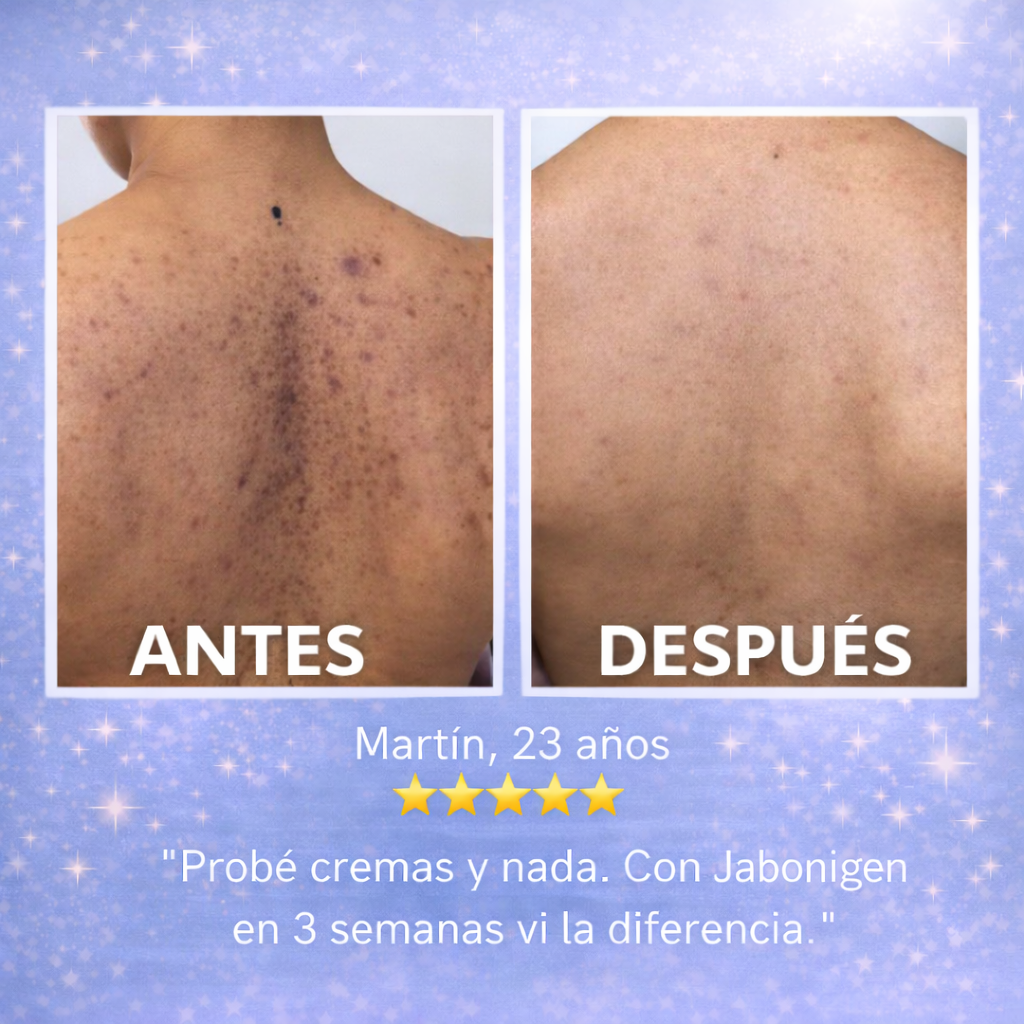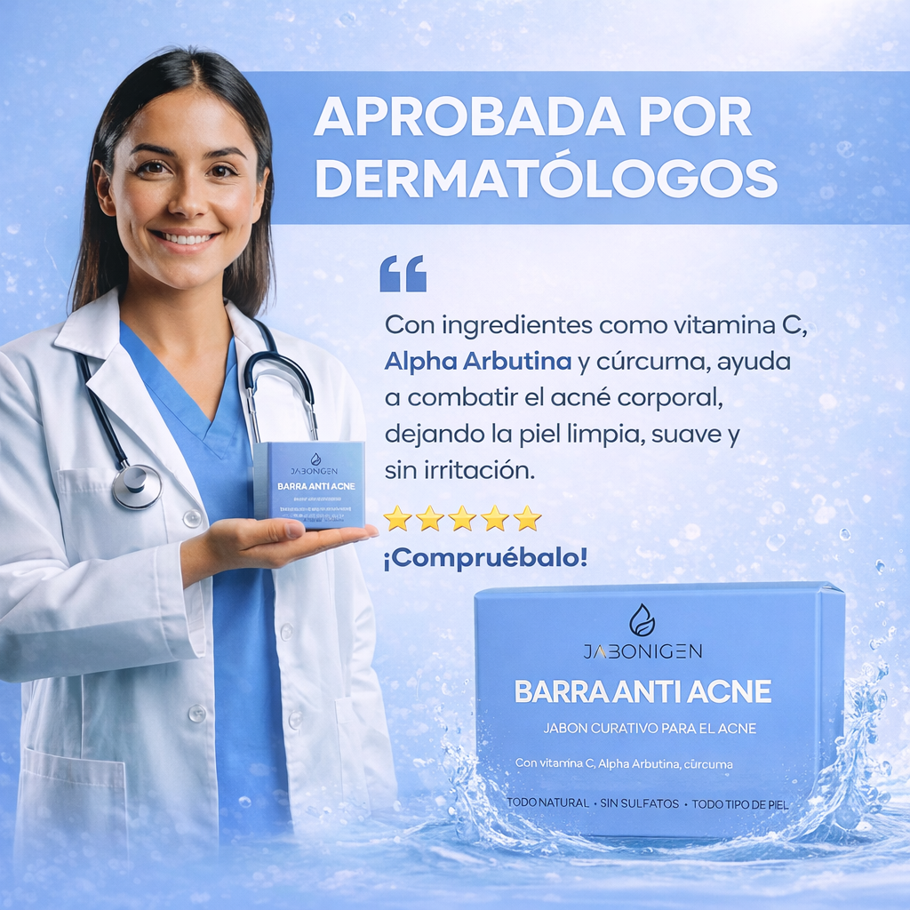 La Barra Anti Acné JABONIGEN fue creada para atacar el problema desde la raíz, limpiando profundamente la piel sin resecarla y ayudando a reducir brotes visibles en rostro y cuerpo.